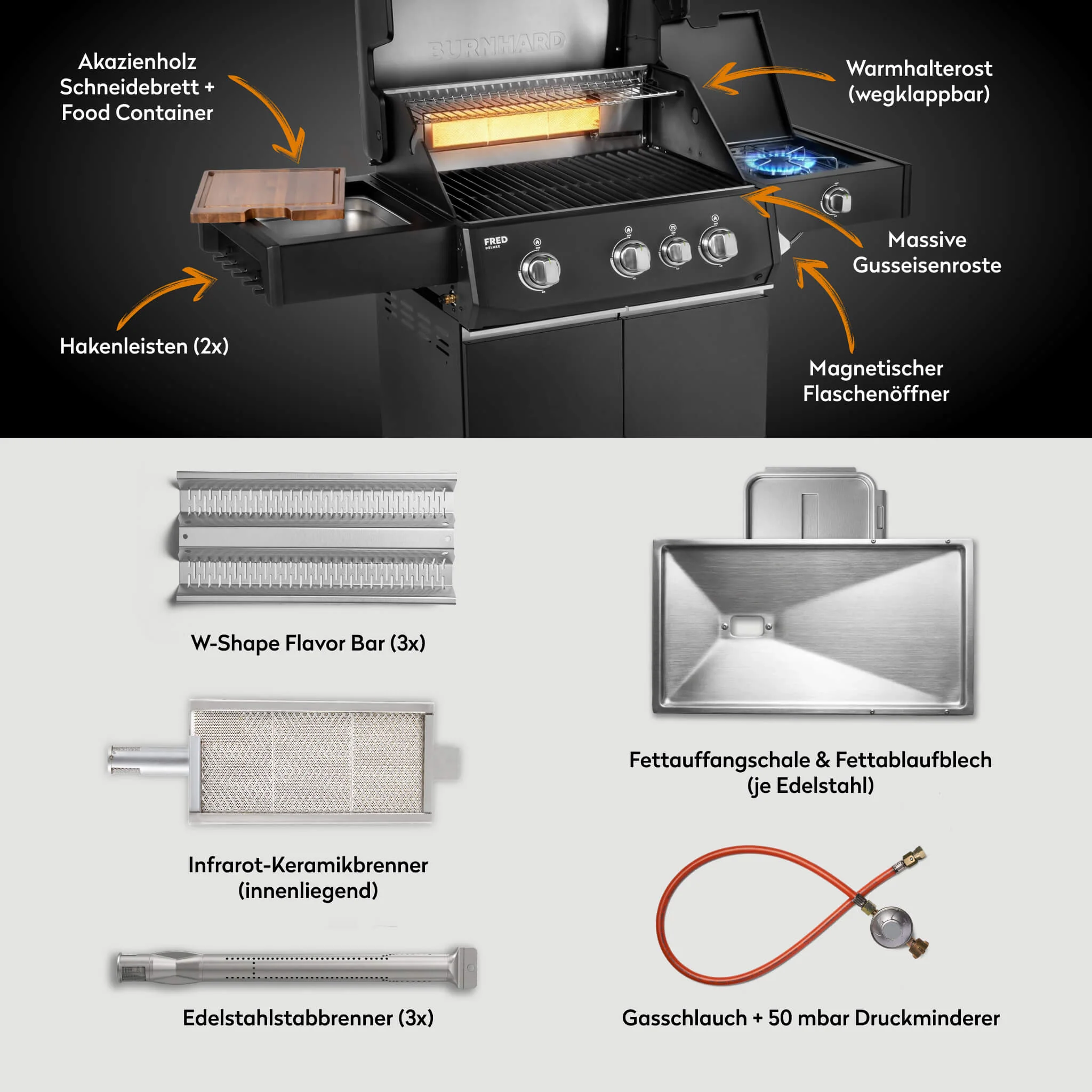 Der FRED Deluxe bietet dir ein leistungsstarkes Setup aus Edelstahl Stabbrennern Infrarot Keramikbrenner und Heckbrenner. Damit kannst du flexibel zwischen direktem Grillen indirektem Garen und Rotisserie wechseln und hast immer die perfekte Hitze für jedes Grillgut. :contentReference[oaicite:0]{index=0}