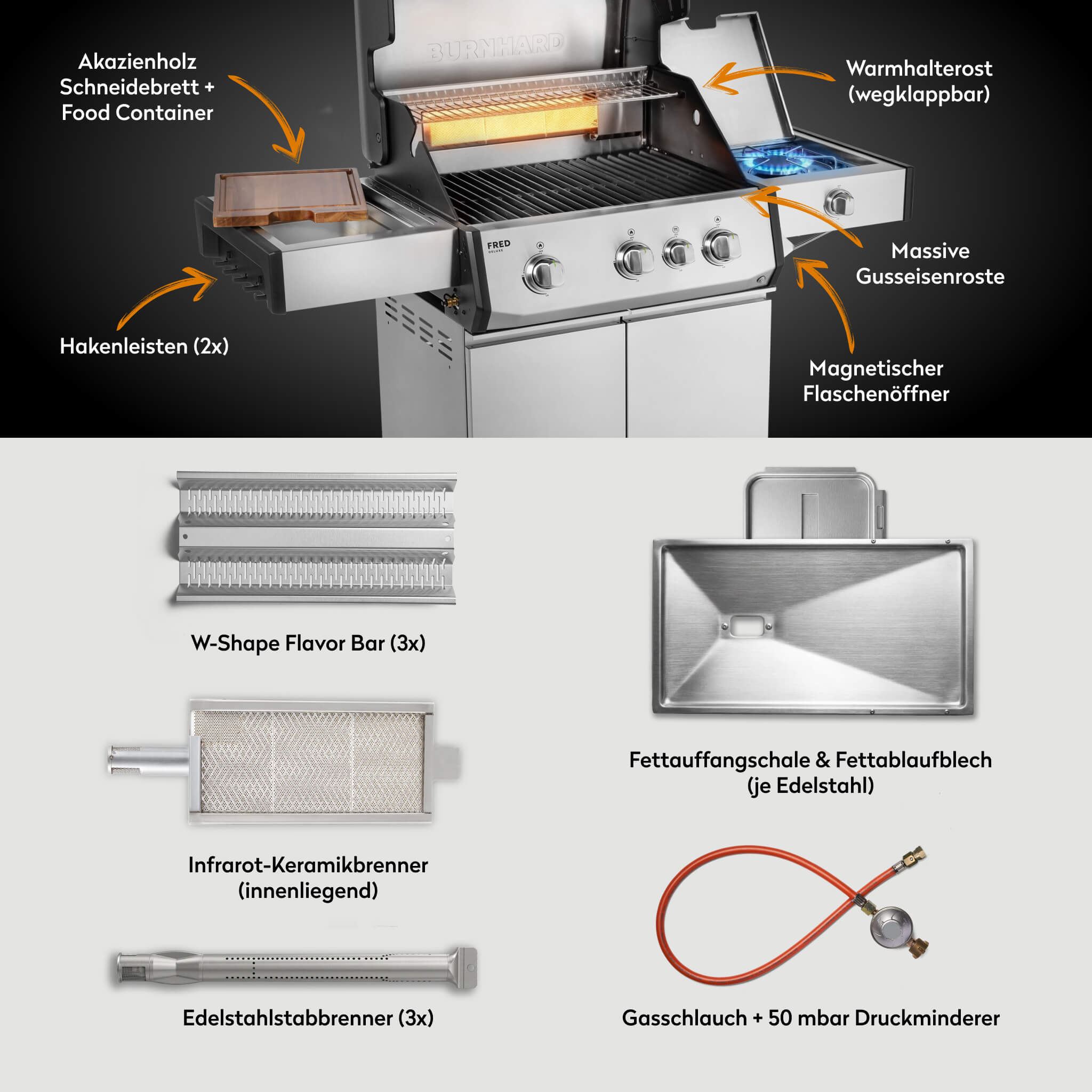 Produktinformationen "BURNHARD FRED Deluxe Gasgrill 3 Brenner Series 4 Edelstahl Grill Maximale BBQ Power langlebig hochwertig"