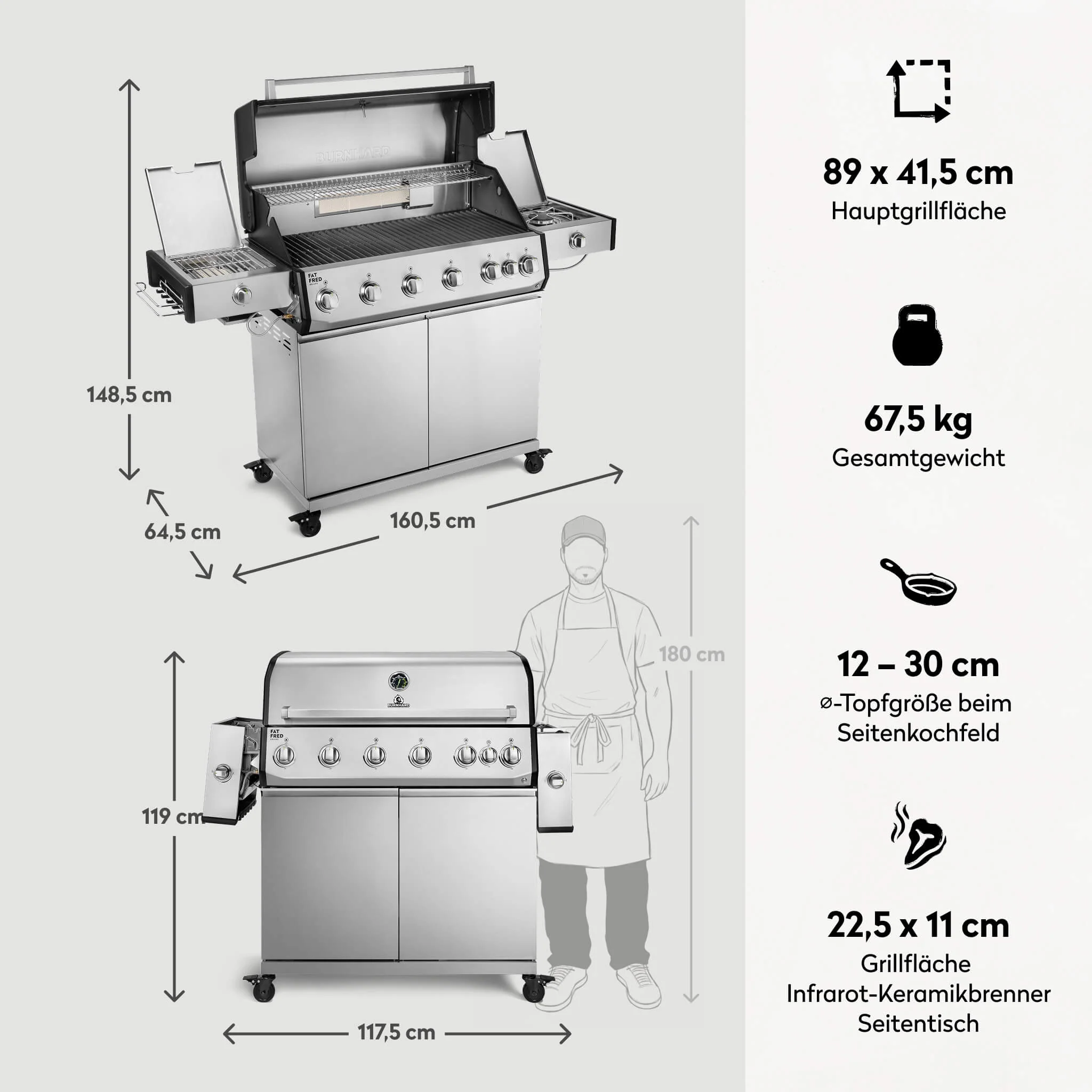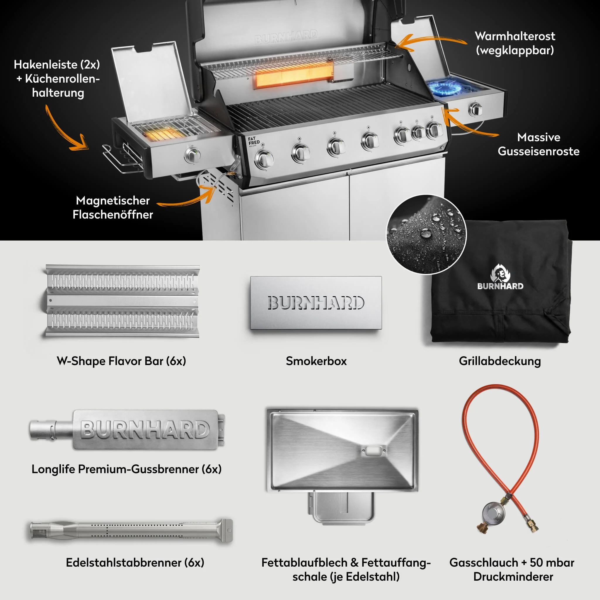 BURNHARD Fat FRED Deluxe Plus Gasgrill 6 Brenner Series 4 Edelstahl Grill mit Gusseisen Grillrost Maximale BBQ Power 30,7 kW XXL Premium Ausstattung