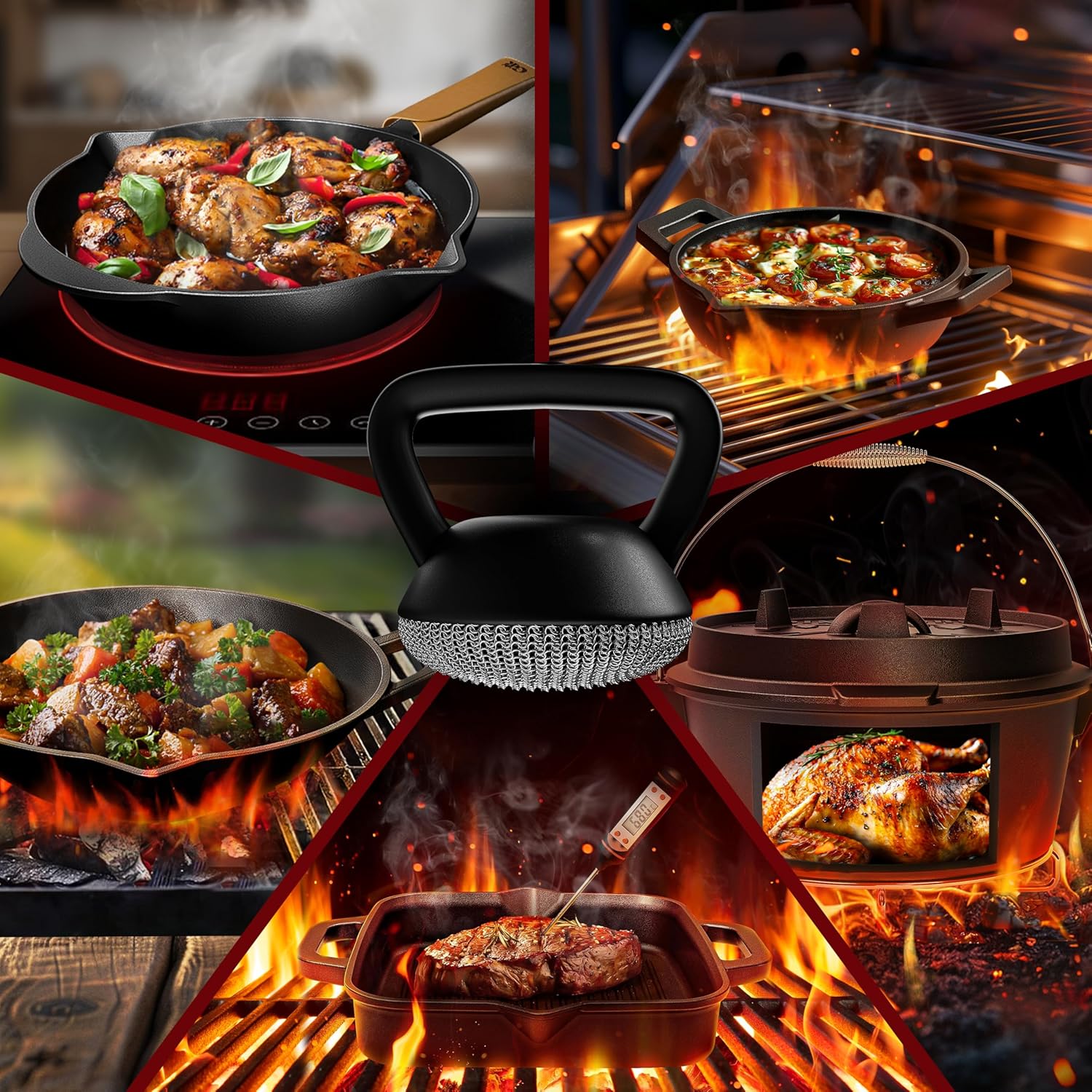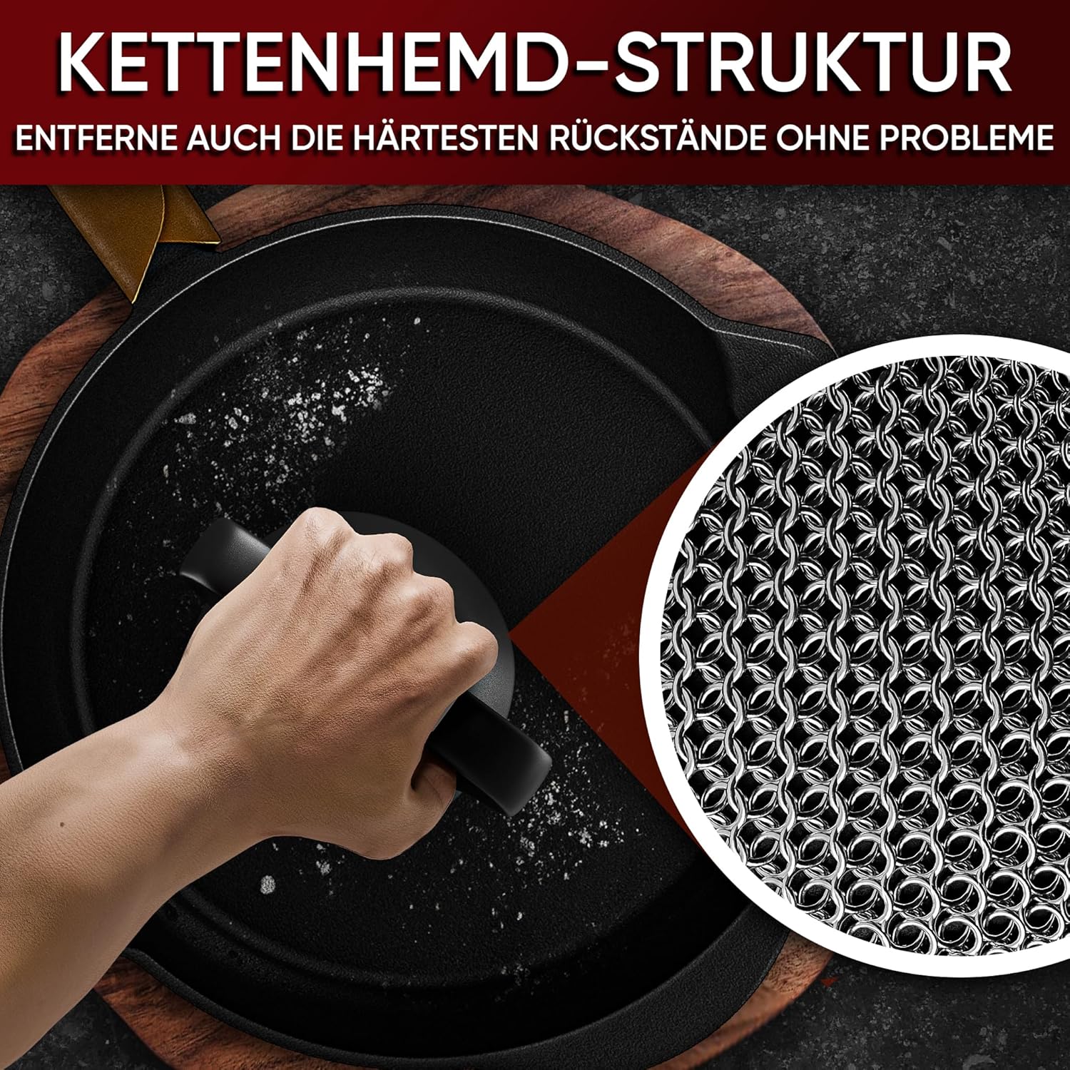 Gusseisen und Dutch Oven benötigen eine besondere Pflege, da aggressive Schwämme oder Reinigungsmittel die Schutzschicht beschädigen können. Der Ringreiniger besteht aus hochwertigem Edelstahl und reinigt rein mechanisch. Dadurch wird das Material effektiv gesäubert, während die Patina erhalten bleibt. Chemische Reiniger sind nicht notwendig.
