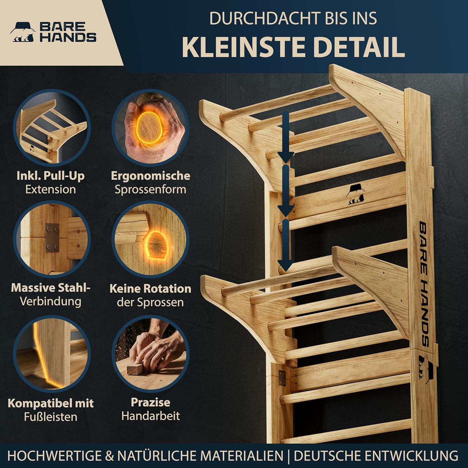 Mit der BARE HANDS 3in1 Sprossenwand erhältst du ein professionelles Trainingsgerät für zu Hause das Kraft Beweglichkeit und Koordination nachhaltig fördert.