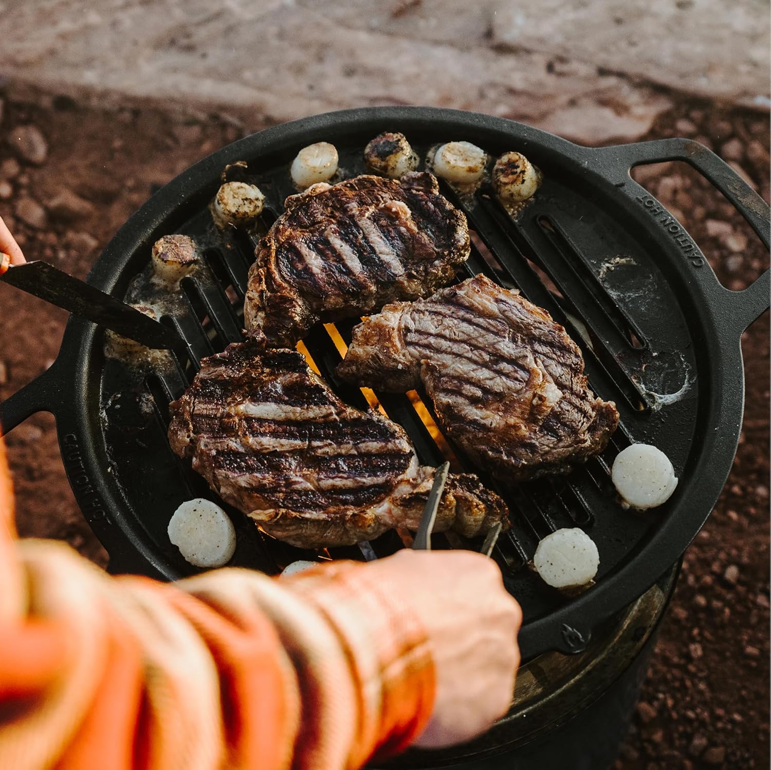 Dank der gleichmäßigen Hitzeverteilung des Gusseisens gelingt das Grillen auch über offenem Feuer zuverlässig. Nach dem langsamen Aufheizen hält eine einzige Schicht Glut die perfekte Temperatur - ideal für gleichmäßig gegartes Grillgut.
