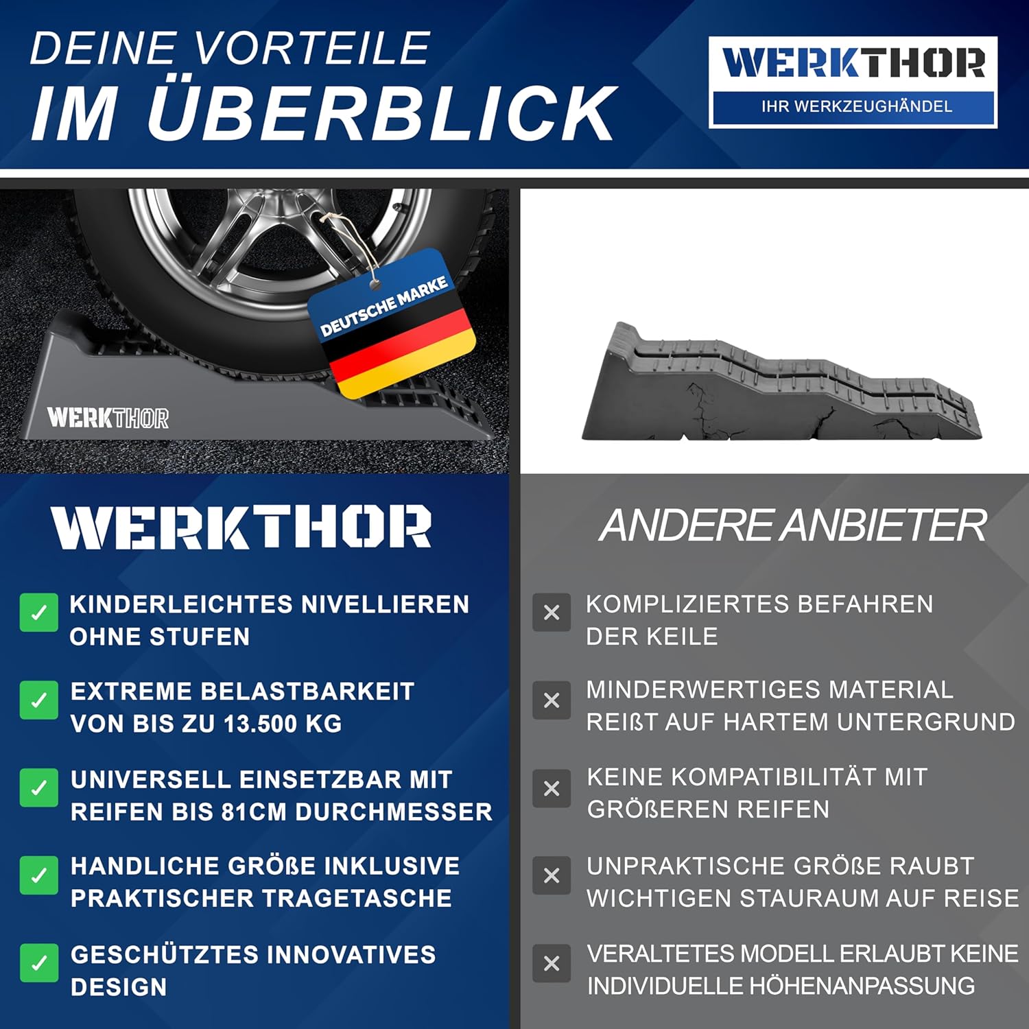 Entdecken Sie die WERKTHOR Auffahrkeile, die Ihnen eine einwandfreie Ausrichtung Ihres Wohnwagens ermöglichen. Verabschieden Sie sich von lästigen Schräglagen, die Ihren Schlaf, Ihre Kochkünste und sogar Ihre Duscherlebnisse beeinträchtigen können!